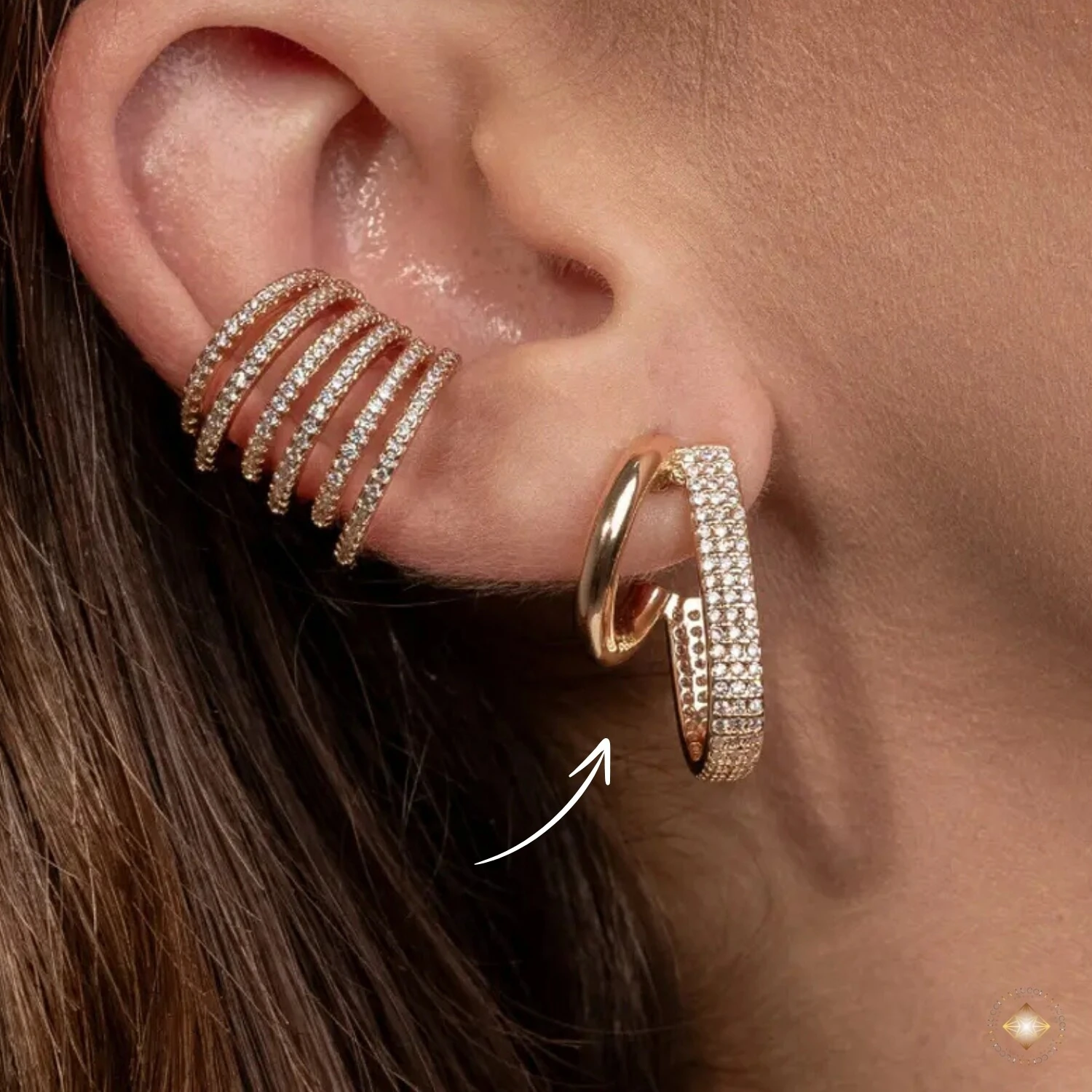 O efeito visual lembra dois brincos sobrepostos, trazendo praticidade com um único furo. Ideal para quem busca presença e brilho, sem abrir mão do conforto.