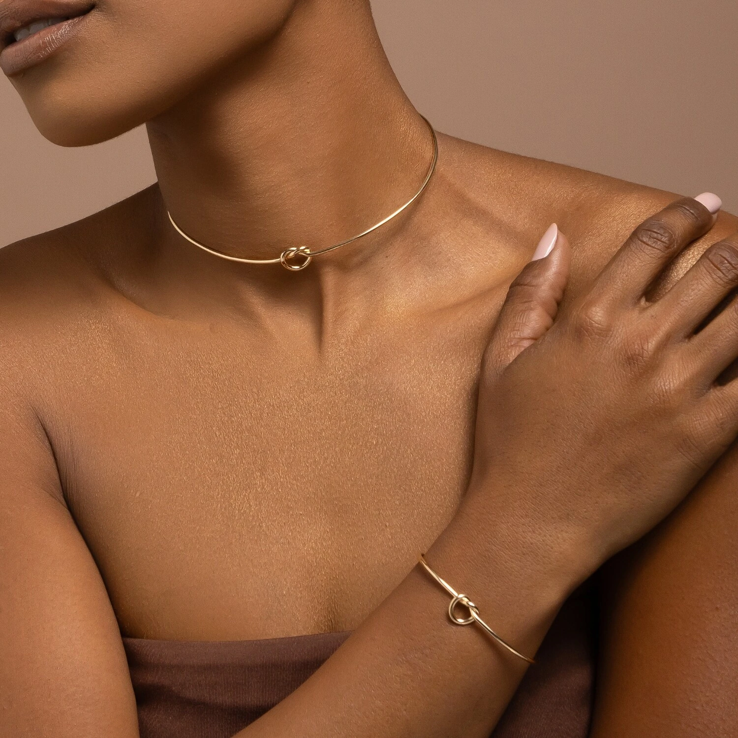 O Bracelete Nó é uma peça minimalista com um toque especial de significado. Com estrutura rígida e formato aberto, ele apresenta um delicado nó central que representa união, conexão e força — um símbolo perfeito para carregar no dia a dia.