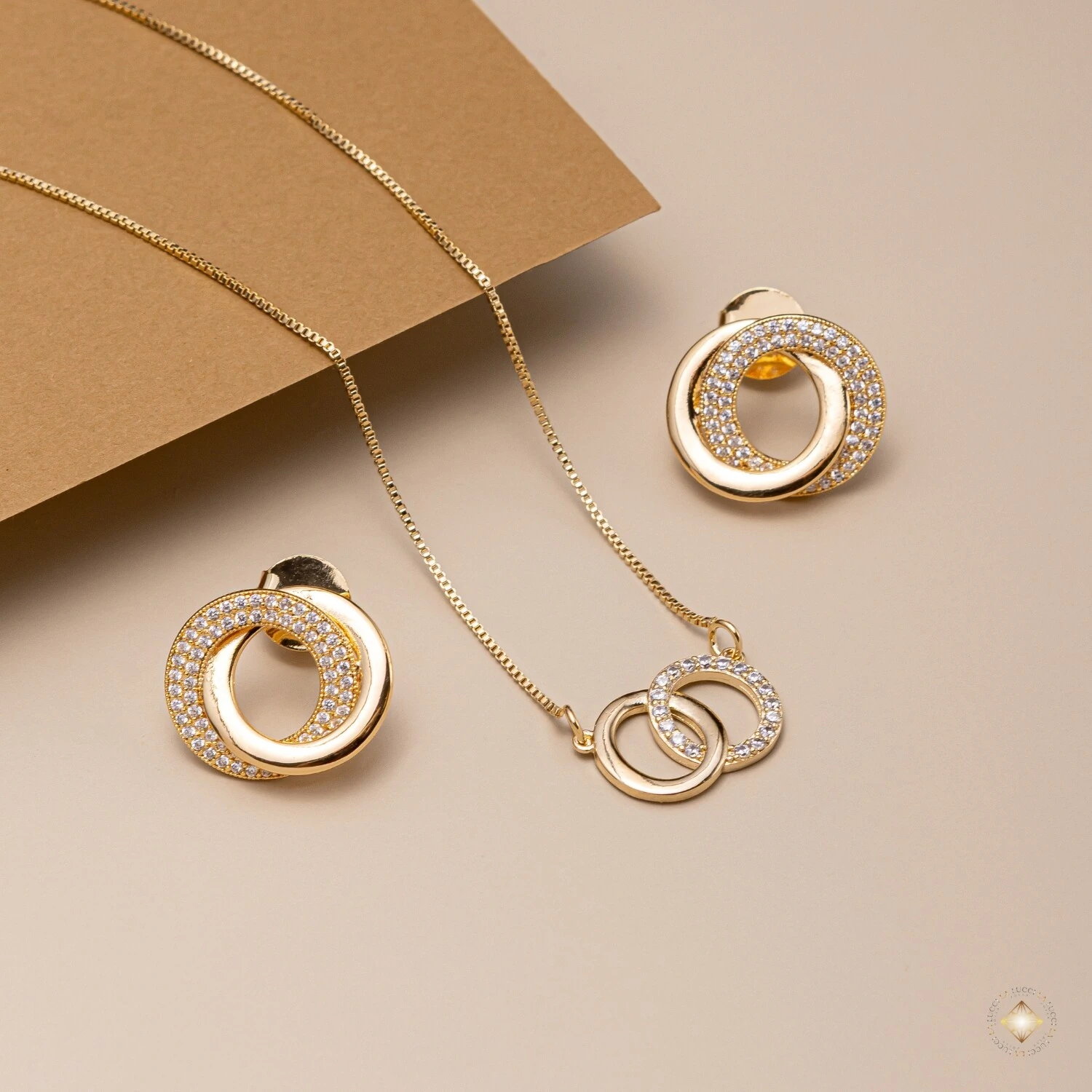 O Conjunto Elos Entrelaçados Cravejados é a combinação perfeita entre modernidade e elegância. Composto por colar e brinco com design de elos circulares interligados, ele cria um visual sofisticado e cheio de significado.