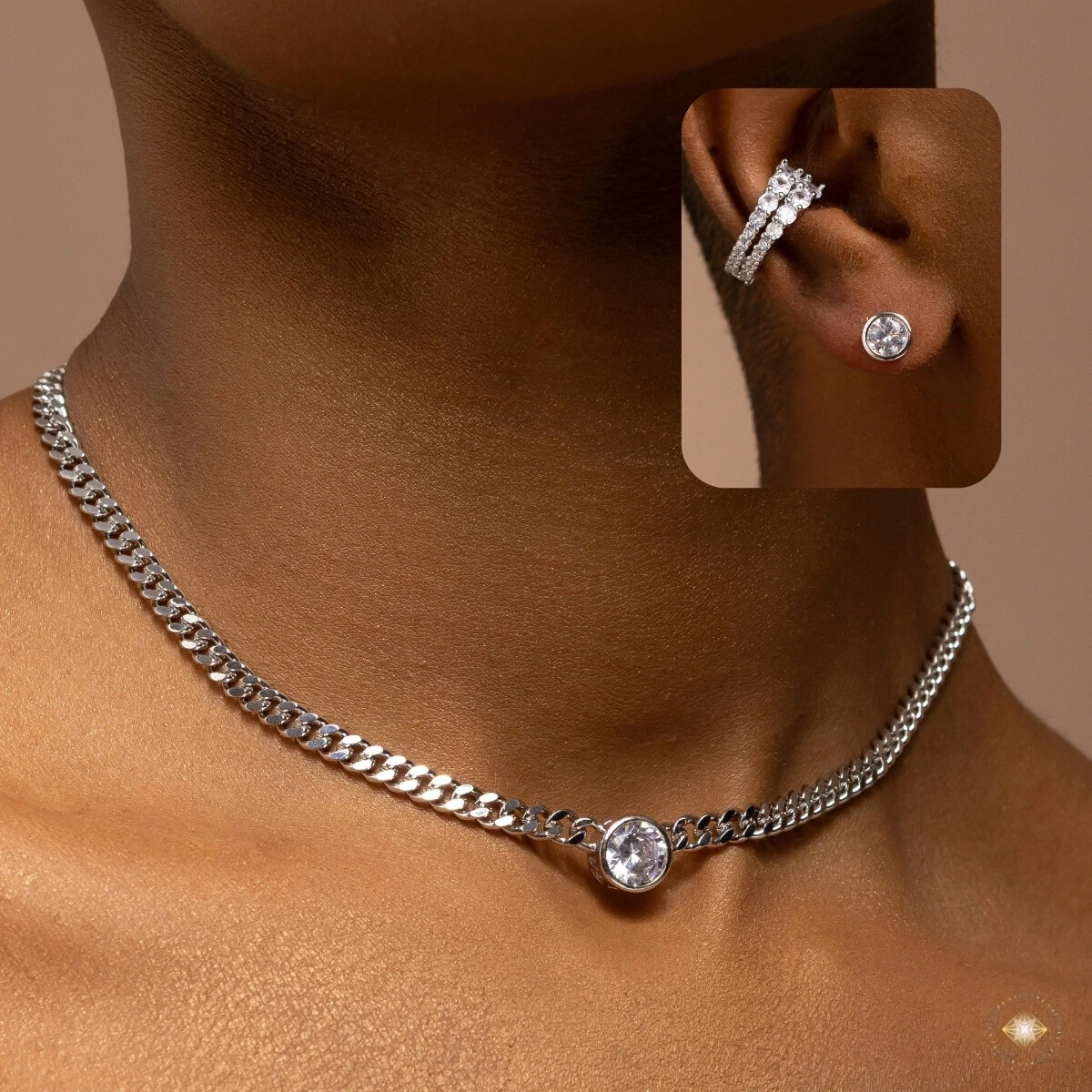 Este conjunto correntaria com ponto de luz é a escolha perfeita para quem busca um toque de brilho discreto e refinado. O design clássico da corrente unida à zircônia cravejada cria um visual que transita entre o casual e o sofisticado, ideal para complementar qualquer look. Ele oferece versatilidade e elegância, e fecho boia frontal facilita o uso, trazendo mais praticidade ao conjunto.