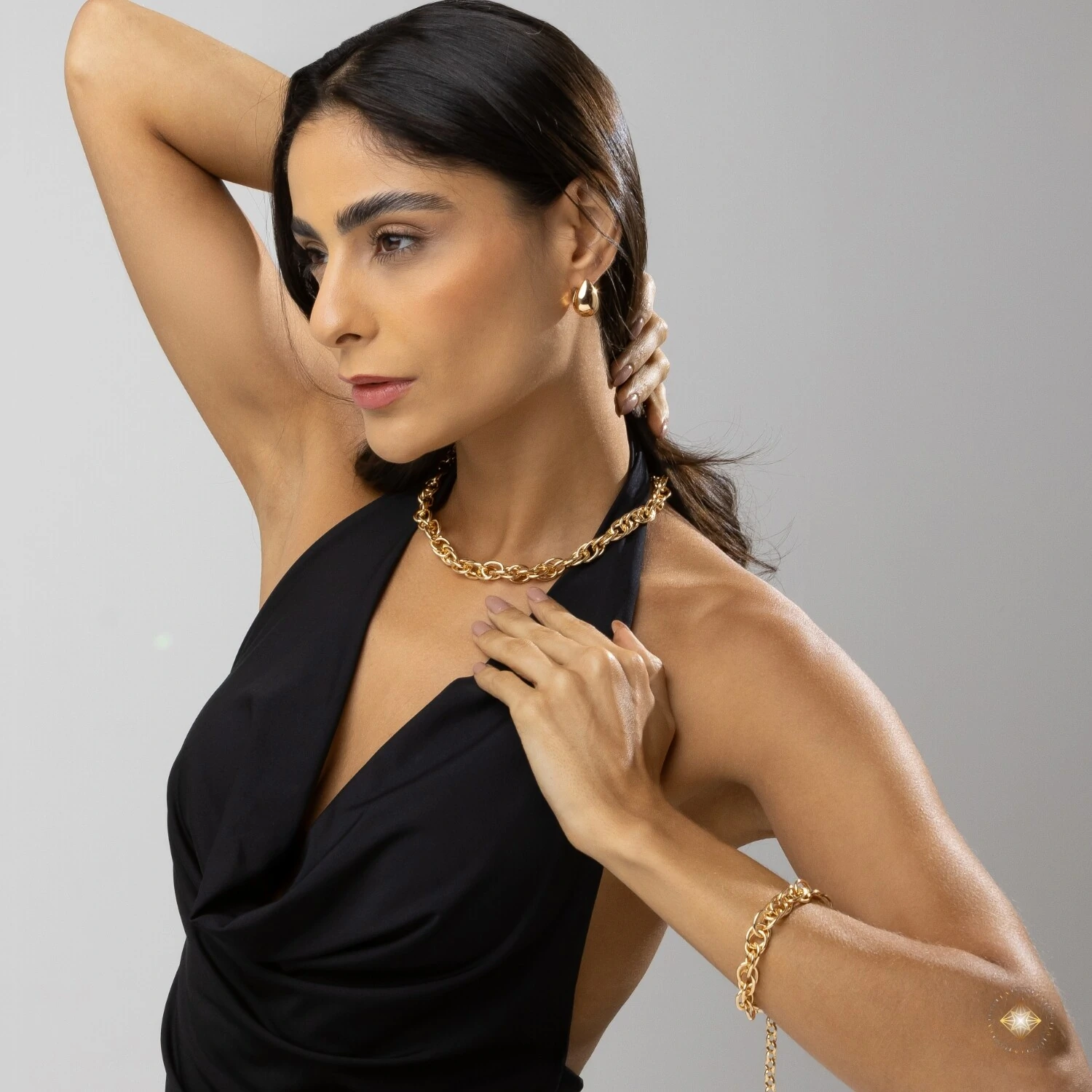 A Pulseira Correntaria Elos Trançados é uma peça marcante que combina perfeitamente com produções modernas e cheias de atitude.