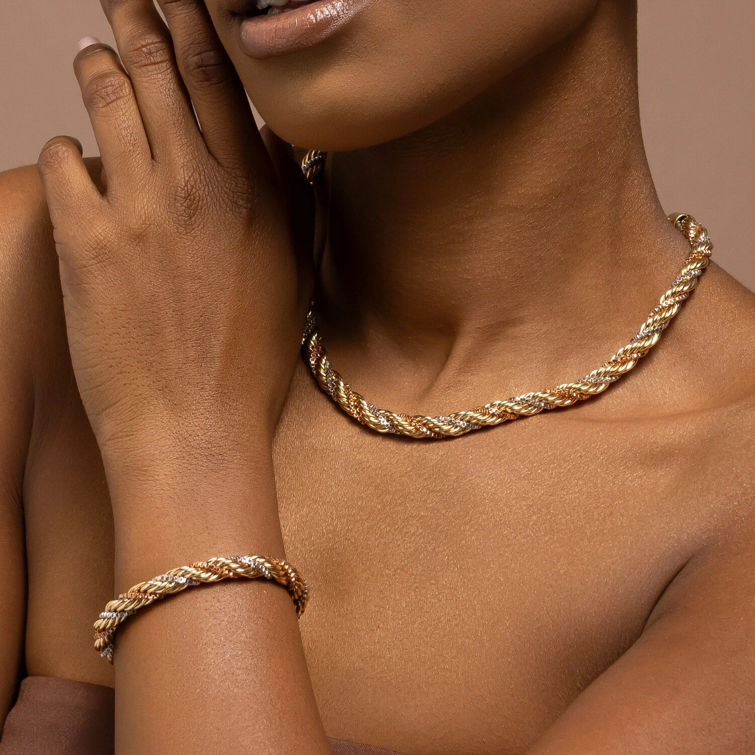 Com um design que esbanja presença e sofisticação, a Pulseira Malha Torcida Três Ouros é a escolha ideal para quem ama acessórios imponentes. Seu trançado robusto combina o brilho dos banhos dourado, rosé e ródio branco em uma composição harmônica e poderosa. O fecho circular dá um charme extra à peça, completando o visual com personalidade.